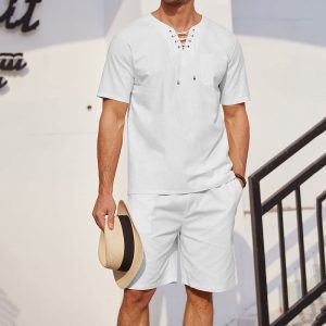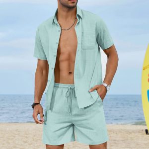 Custom Men’s 2 Piece Linen Set Short Sleeve Summer Beach Yoga Pants Outfits